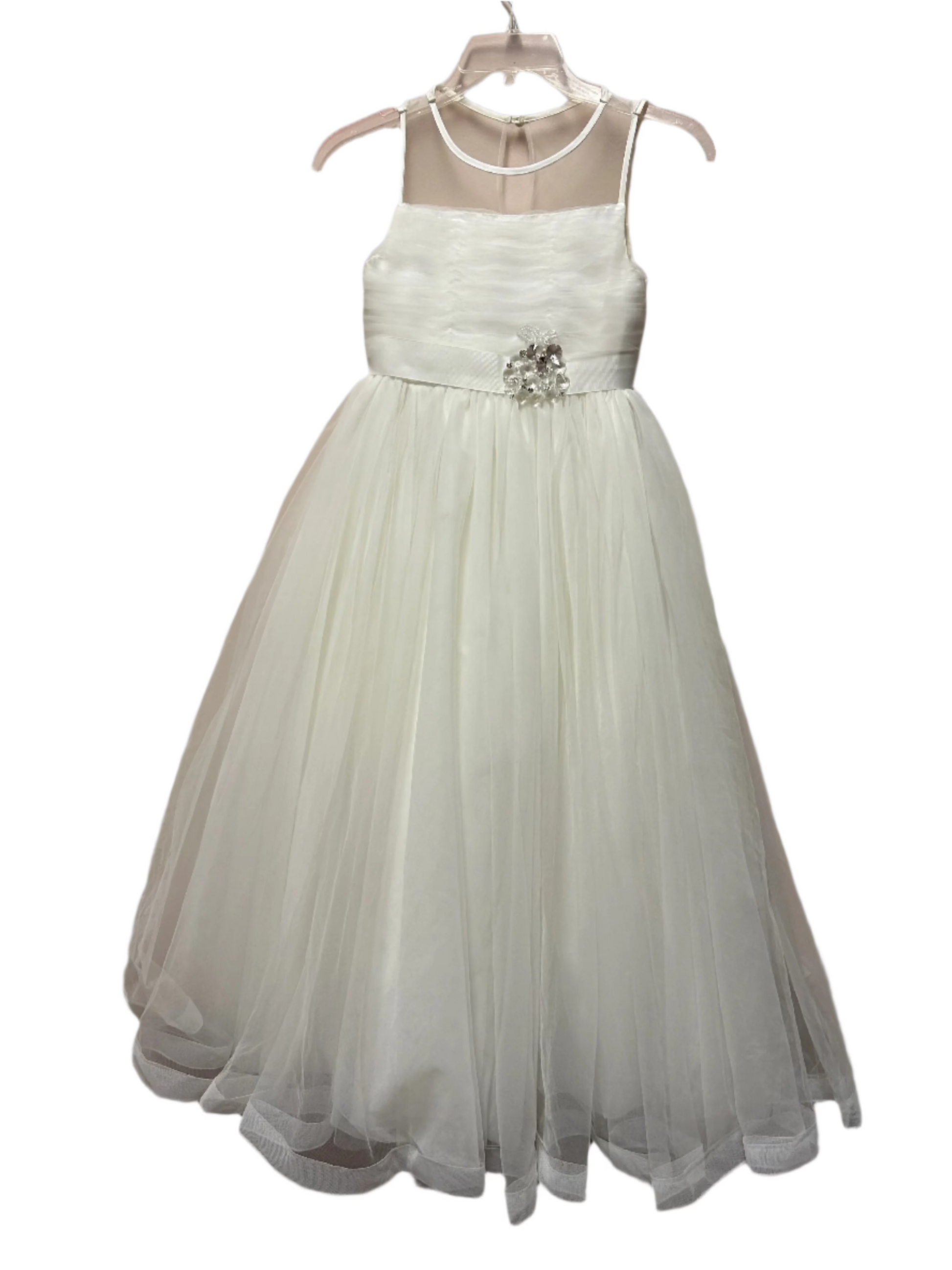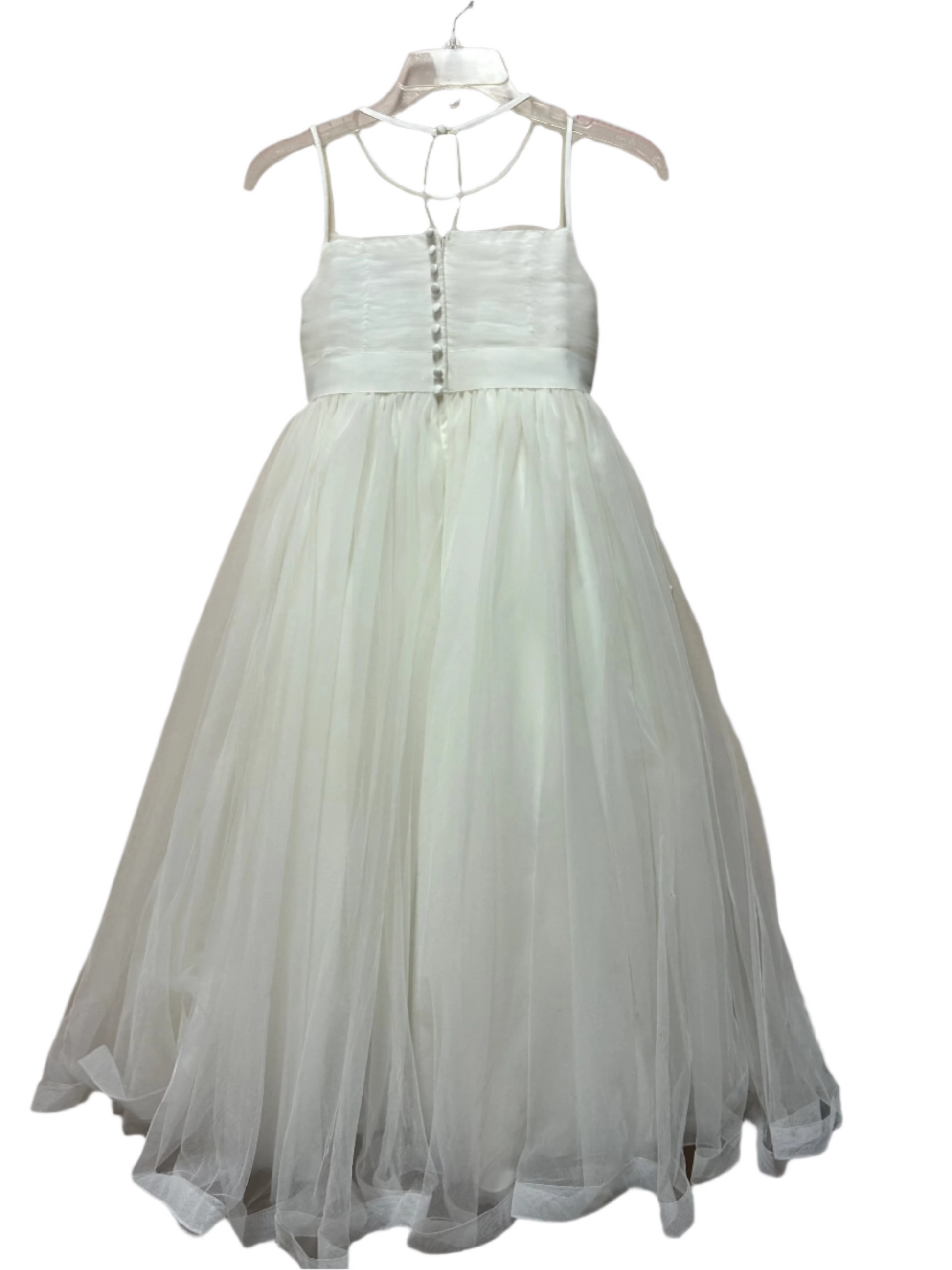 This size 10 Disney Fairy Tale Weddings dress by Alfred Angelo features an elegant ivory fabric adorned with royal blossom motifs, perfectly blending classic charm with a touch of fantasy. Designed specifically for children, it offers a comfortable fit while capturing the magic of a fairy tale wedding. Ideal for special occasions, this dress combines timeless style with delicate detailing to make any young wearer feel like royalty.